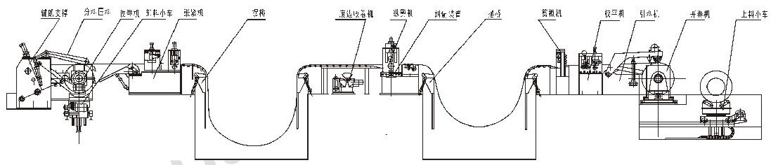 生產(chǎn)線主要由上料小車、開卷機、校平機、縱剪、廢邊收卷機、張緊機、收卷機、卸料裝置等組成。